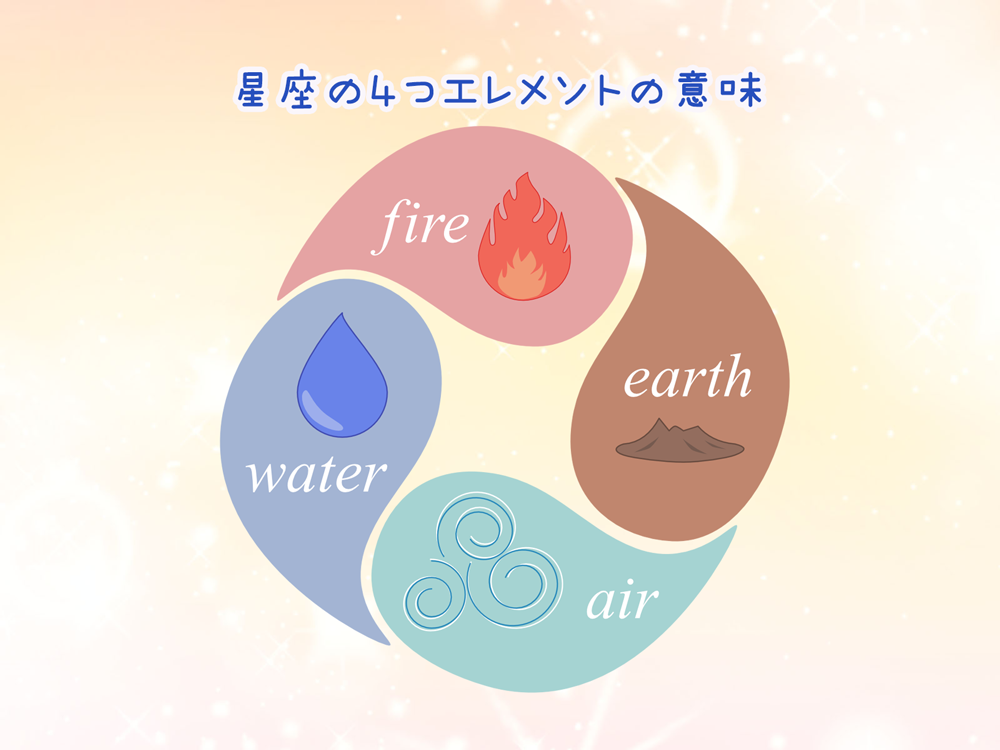 星座は 火・地・風・水 の4つのエレメント(元素)に分けられます。これは「四大元素(Four Elements)」という考え方に基づいていて、もともとは古代ギリシャの哲学者たちが「世界はこの4つのエレメントでできている」と考えたことが始まりなんです。